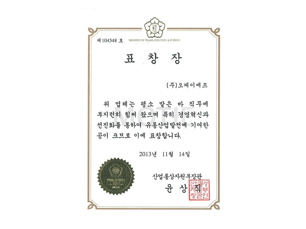 Technology Innovation SME CertificationAndong Factory certified as a technology innovative company (Innobiz-Small and Medium Business Administration) (2012.10.09~2015.10.08)